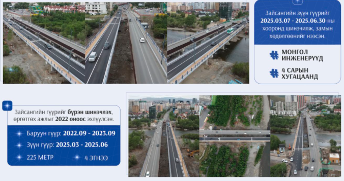 Шинэ гүүрийг зургадугаар сарын 30-нд ашиглалтад оруулсан билээ. Гүүрийн бүтээн байгуулалтад “ЗМЗ” ХХК буюу үндэсний бүтээн байгуулагч аж ахуйн нэгж шалгарч, дотоодын чадварлаг инженер, техникийн ажилчид ажилласан. Гүүрийг шинэчилж, 225 метр урт хос гүүр барьснаар дөрвөн эгнээ авто замаас ирэх ачааллыг гүүрээр саадгүй нэвтрүүлэх боломж бүрджээ.